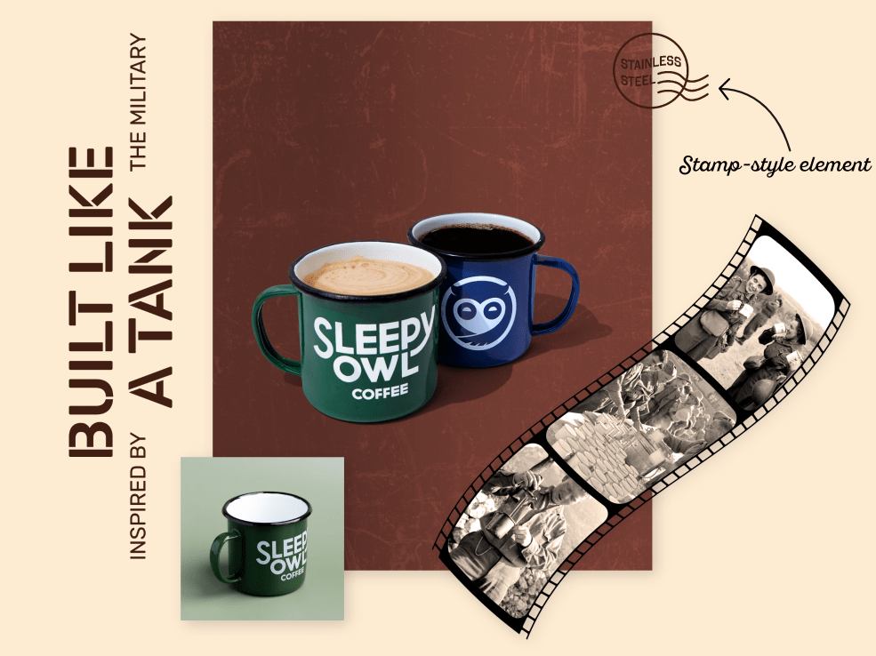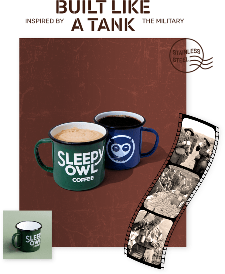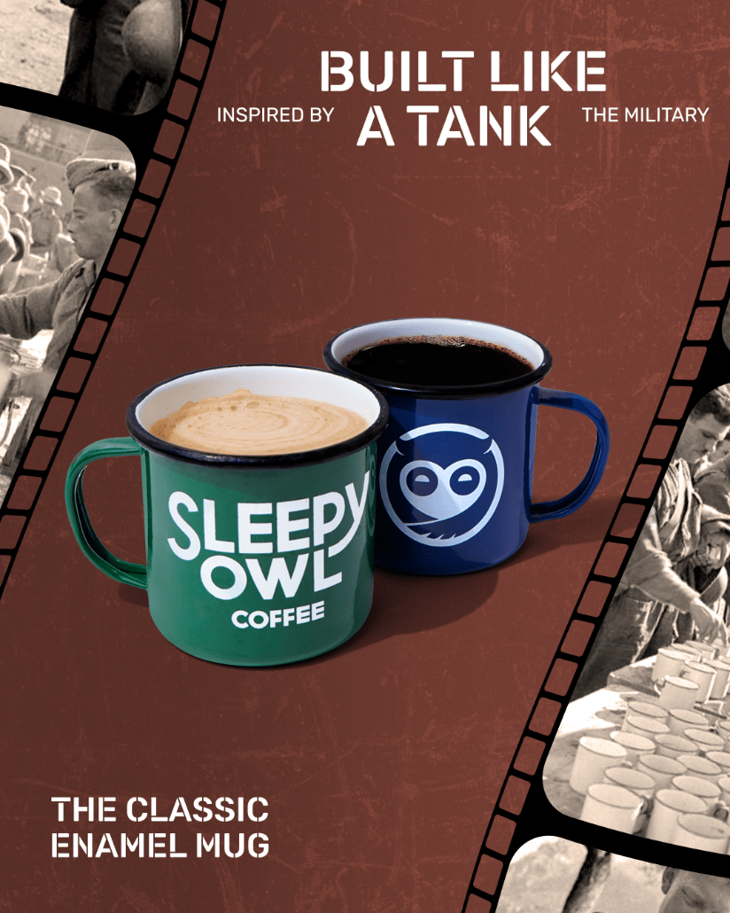 We leaned into the enamel mugs’ history with the military. Dating all the way back to the second world war, these mugs were meant to survive the rough and tumble lifestyle of those on the battlefield. Today, they’re a sturdy and stylish way to have some real good coffee.