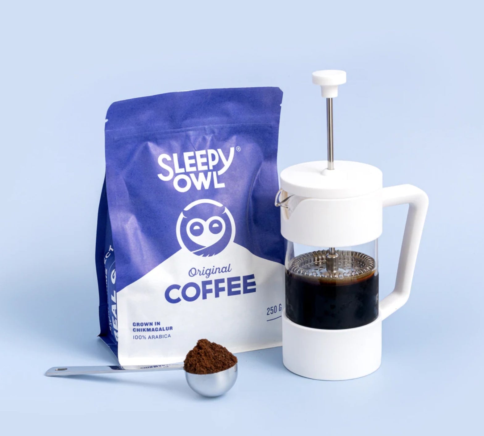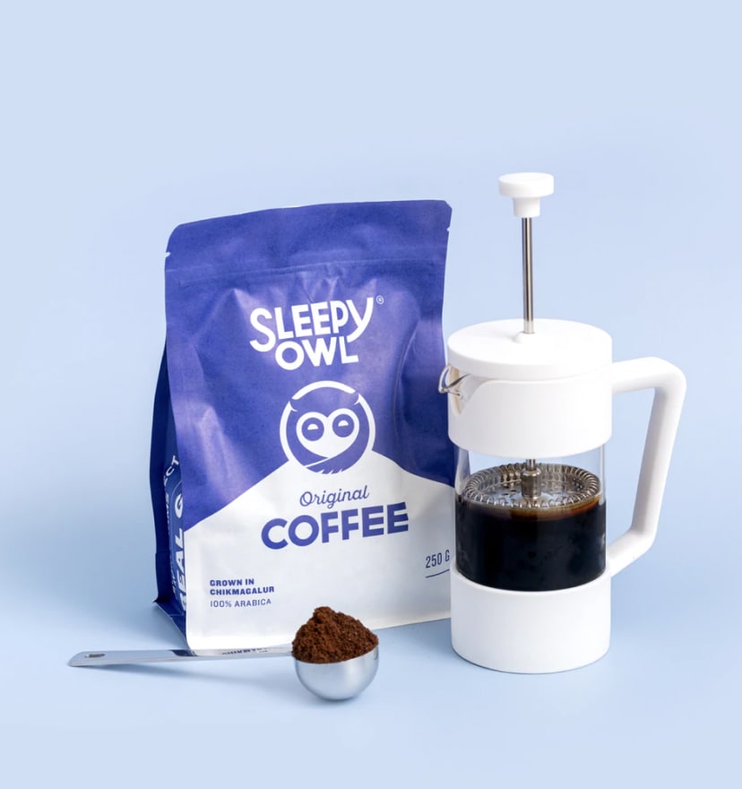 Get your favourite Sleepy Owl Ground Coffee flavour along with our thoughtfully designed French Press to create a coffee travel kit like never before. Our French Press can be easily taken anywhere with you so you can have your kind of fresh French Press coffee anywhere you want. Our French Press is made with borosilicate glass, stainless steel and food-safe plastics. It has a two layered filter which keeps the coffee grounds away from the coffee concentrate. It also has a grated spout which is perfectly shaped to ensure a smooth pour from the French Press into your coffee mug. You can make two cups in one press, which is simply perfect to get through your day. Remember to get only our coarse Ground Coffee for the French Press. This coffee making kit is truly one-of-a-kind.