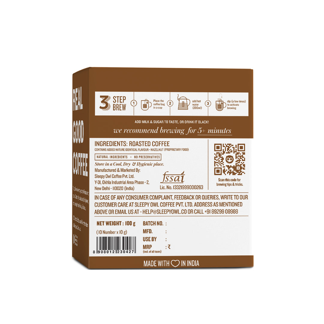 Hazelnut is one of our most enjoyed coffee flavours amongst our Hot Brews. The nutty notes of hazelnut hot brew blend well with our well-rounded 100% Arabica coffee. Enjoy a cup of balanced, aromatic, and nutty-smooth coffee without the hassle. All you have to do is brew it in hot water for 5 minutes.