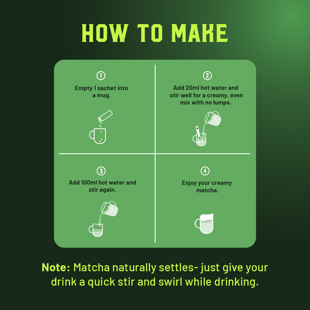 Meet Matcha. Born in Japan, Matcha has been a ritual of calm for centuries—whole leaves, finely ground, rich in energy and antioxidants. Now, we’ve whisked it into a creamy latte you can enjoy anytime. No lumps, no hassle—just add hot water and enjoy delicious Matcha in seconds!